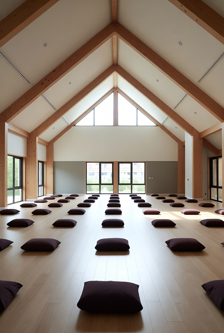 A spacious meditation hall features a high wooden beamed ceiling and large windows allowing natural light. Rows of purple cushions are neatly arranged on the light wooden floor. The room is empty with a serene, minimalist design.