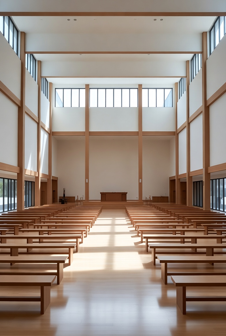 Japanese architecture, altar, architecture, beams, chapel, empty church, high ceiling, interior, large windows, minimalist design, modern church, natural light, pews, sanctuary, sunlight, white walls, wooden beams, wooden floor, wooden pews, worship hall, church