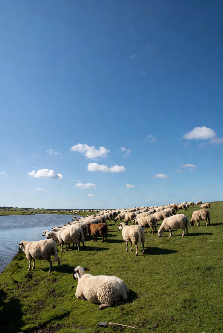 A large herd of white sheep with some brown ones gathers along the grassy edge of a serene lake under a clear blue sky with scattered clouds. The sheep stand and lie down on the green pasture near the water. The landscape features open fields extending into the distance.