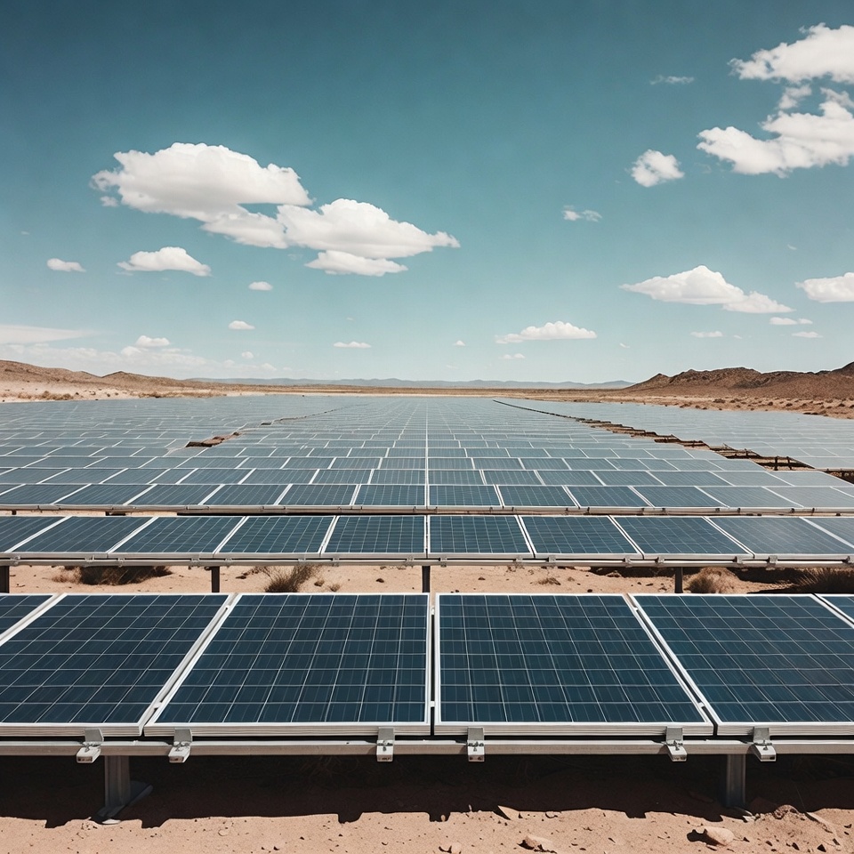 arid landscape, blue sky, clean energy, desert, dry grass, environment, green energy, metal frames, panels, photovoltaic panels, power plant, renewable energy, rocky hills, solar array, solar farm, solar power, sunny day, vast field, white clouds, solar panels