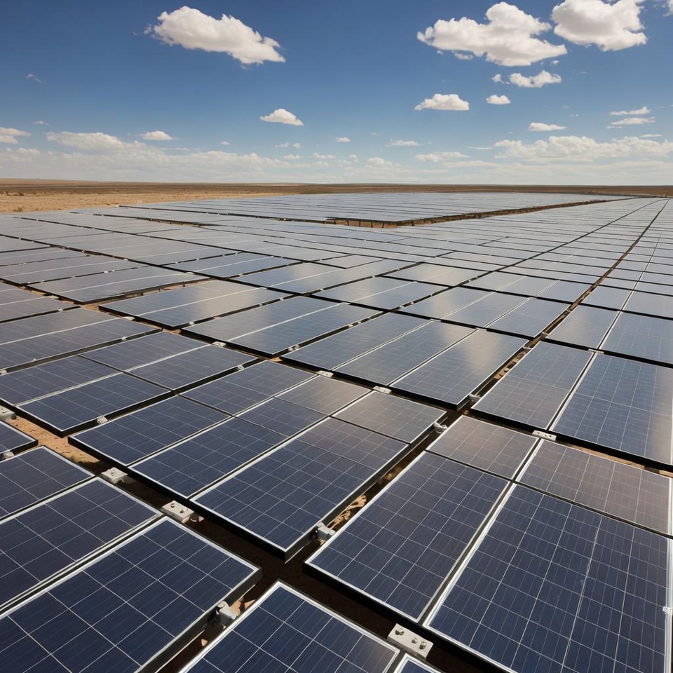 aerial view, arid landscape, blue sky, clean energy, clouds, desert, electricity, environment, metal frames, panels, photovoltaic, power plant, renewable energy, sand, solar array, solar farm, sunny day, sustainability, vast field, solar panels