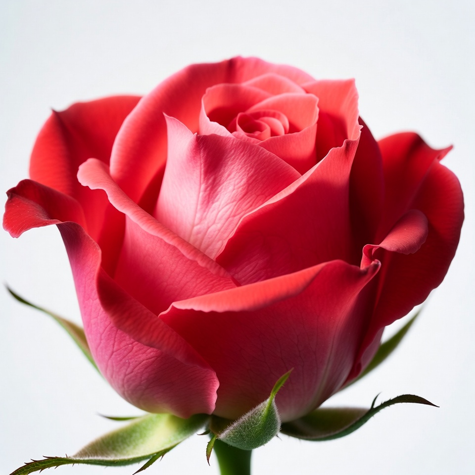 A vibrant pink rose with layered petals is centered against a plain white background. The flower features soft pink hues transitioning to deeper red at the edges, with green sepals at the base. Dew-like droplets accentuate the petals' texture.