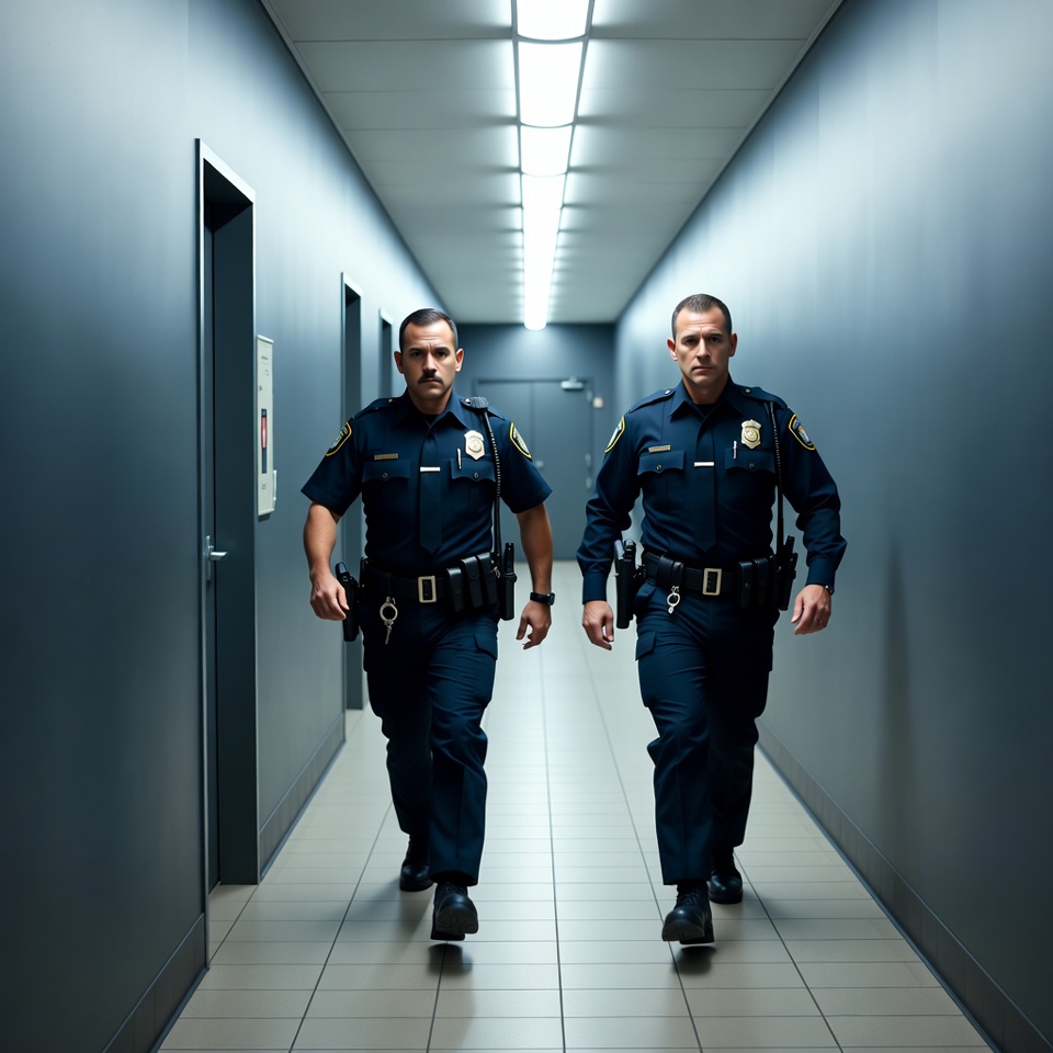 Two male police officers in dark blue uniforms walk down a long, narrow hallway with gray walls and tiled floors. They wear badges, belts with gear, and black boots, illuminated by overhead fluorescent lights. Doors line both sides of the corridor.