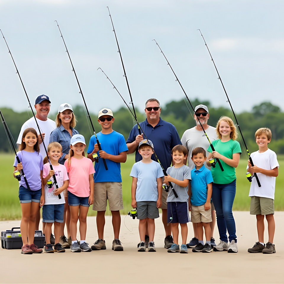Large family fishing together outdoors
