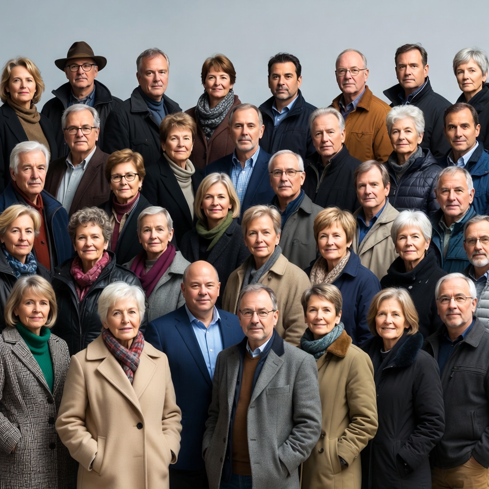 A large diverse group of middle-aged and older men and women stands closely together in a formal group portrait. They wear coats, jackets, scarves, and hats in various colors against a plain gray background. The individuals face the camera with neutral expressions.