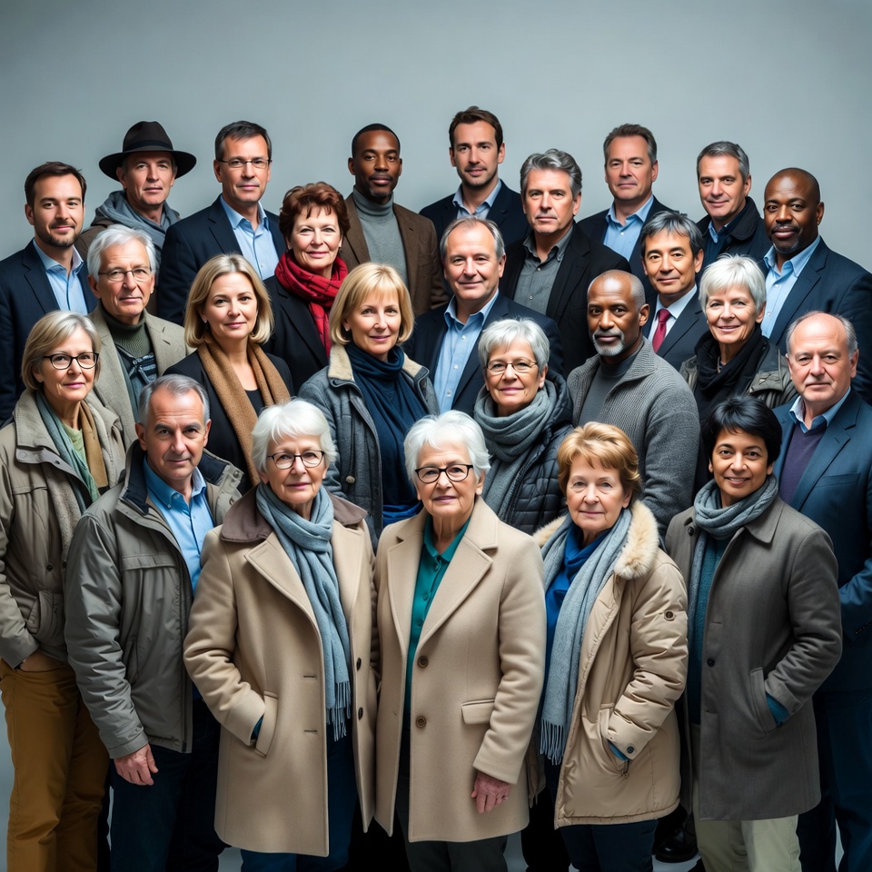African-American, Asian, White, adults, business attire, coats, colleagues, corporate group, diverse group, elderly, formal wear, glasses, gray background, gray hair, men, middle-aged, mixed ages, portrait, professionals, scarves, smiling, standing, suits, team, women, group photo