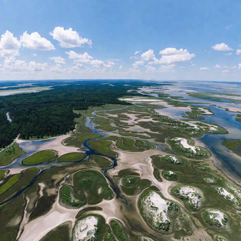 bay, blue sky, coastal landscape, drone photo, ecosystem, environment, estuary, forests, geography, green vegetation, lagoon, marshland, mudflats, nature, outdoors, panorama, rivers, sandy islands, shoreline, summer, terrain, tidal flats, waterways, wetlands, white clouds, wilderness, aerial view