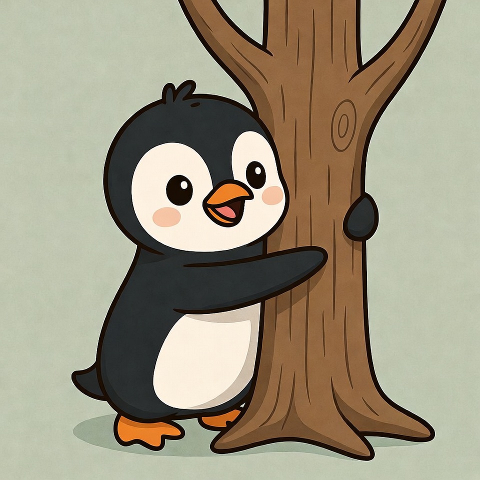 A cartoon penguin with black and white feathers and orange beak happily hugs a tall brown tree trunk. The penguin has large expressive eyes and stands on orange feet. The scene features a light green background with a simple illustrative style.