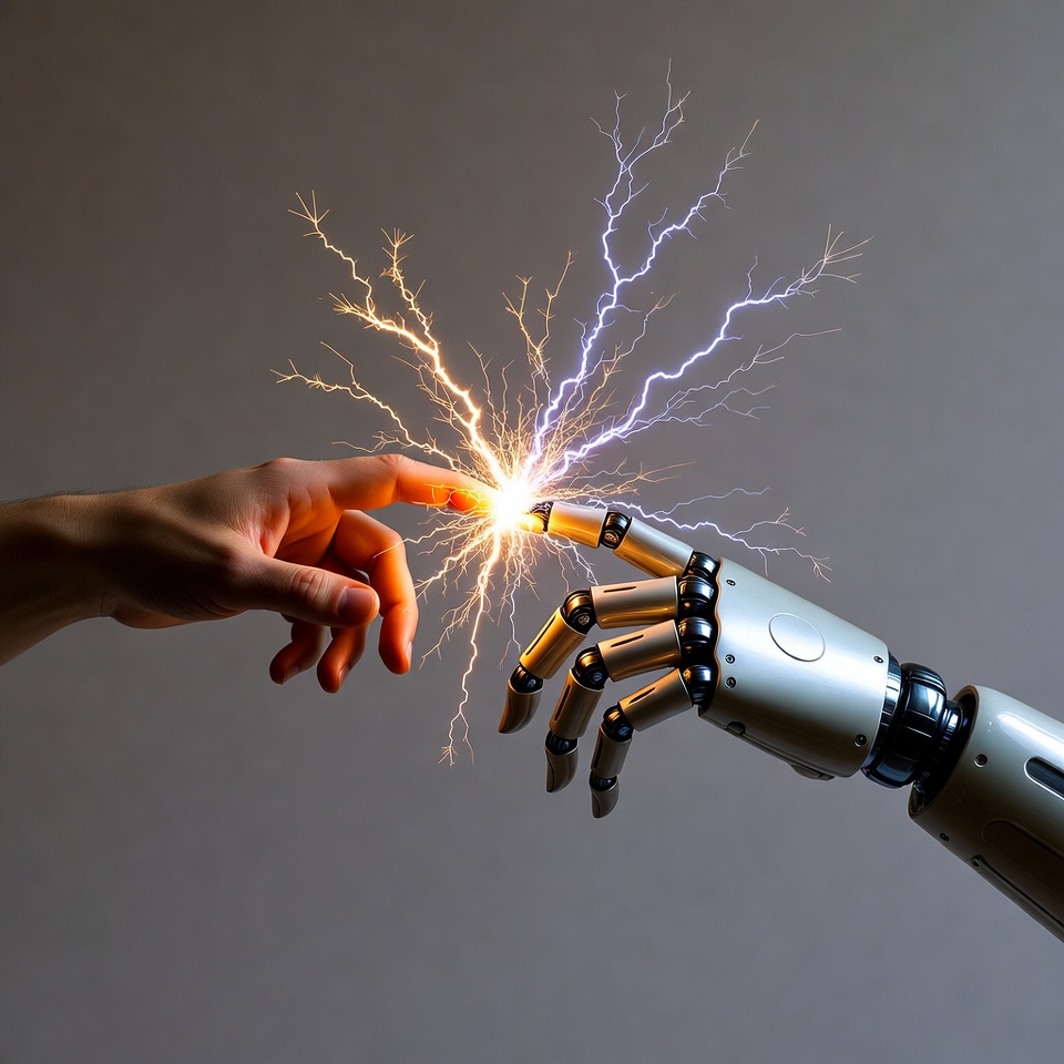 AI, cybernetic, digital art, electric arc, electricity, fingers touching, futuristic, gray background, human-robot interaction, innovation, lightning, mechanical hand, robot hand, robotics, sci-fi, sparks, technology, human hand