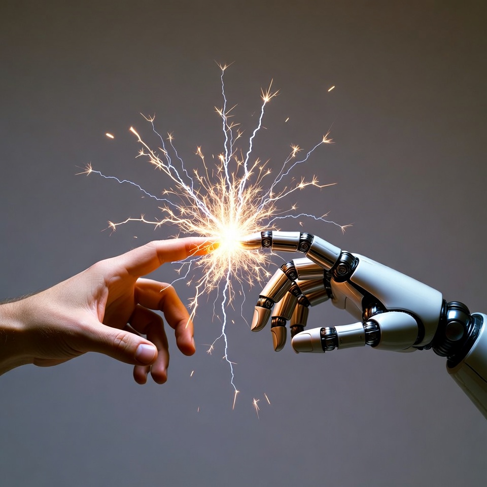 A human hand reaches toward a metallic robotic hand against a dark gray background. Bright yellow electric sparks and energy burst emanate from the point where their fingers nearly touch. The robot hand features detailed mechanical joints and white plating.
