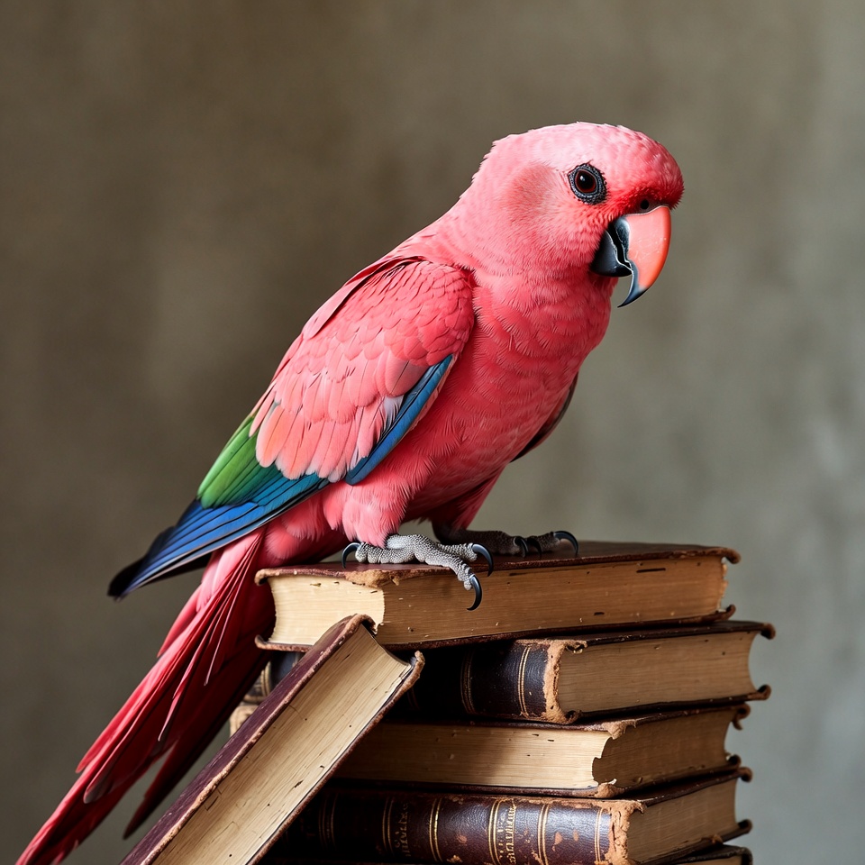 A vibrant pink parrot with green and blue wing accents stands perched atop a stack of old leather-bound books. The bird gazes forward with a bright red eye and curved beak, set against a neutral gray background. Its feathers are detailed and fluffy, emphasizing the isolated pose.