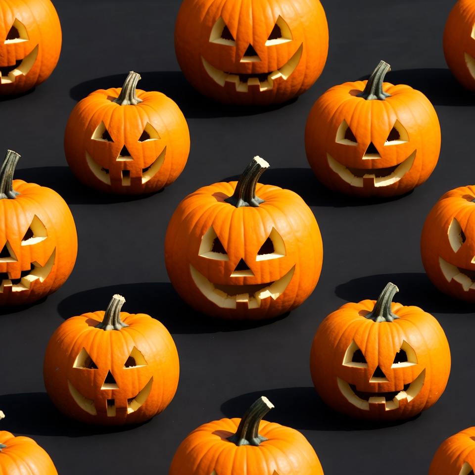 Multiple carved jack-o'-lantern pumpkins with glowing orange faces are arranged on a solid black background. Each pumpkin features triangular eyes, jagged smiling mouths, and some have nose cutouts. The composition creates a spooky Halloween pattern with shadows enhancing the eerie effect.