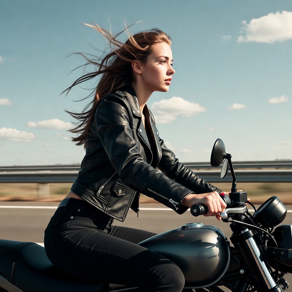 A young woman with long brown hair blowing in the wind rides a black motorcycle on a highway. She wears a black leather jacket and tight black pants, gripping the handlebars firmly. The scene features a clear blue sky with clouds and a blurred road ahead.