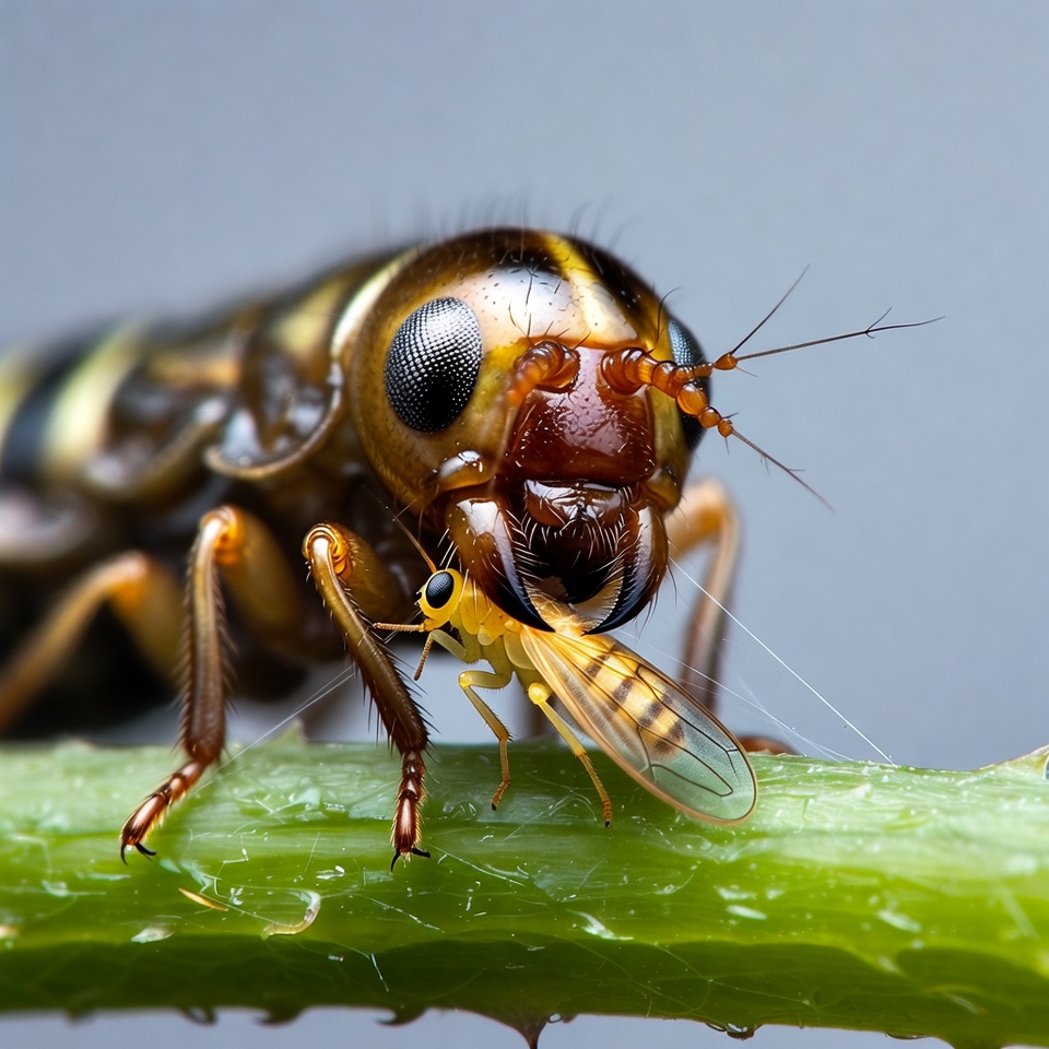 A close-up of a hoverfly with striped body and large compound eyes feeds on a small yellow aphid. The hoverfly grips the aphid with its mouthparts while perched on a green leaf with visible veins. Fine details of the insects' legs, wings, and antennae are sharply captured against a blurred background.