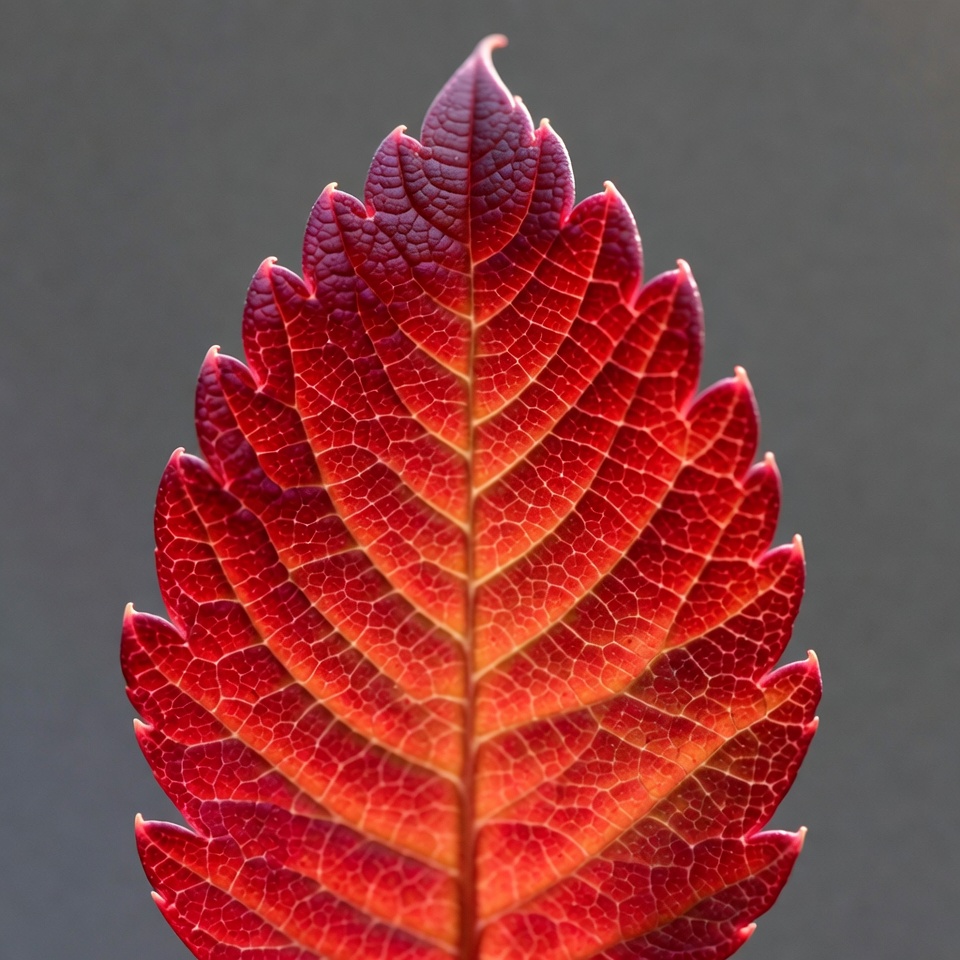 autumn leaf, crimson leaf, fall leaf, foliage, gray background, isolated background, leaf veins, macro leaf, nature, plant, serrated edges, vibrant red, red leaf