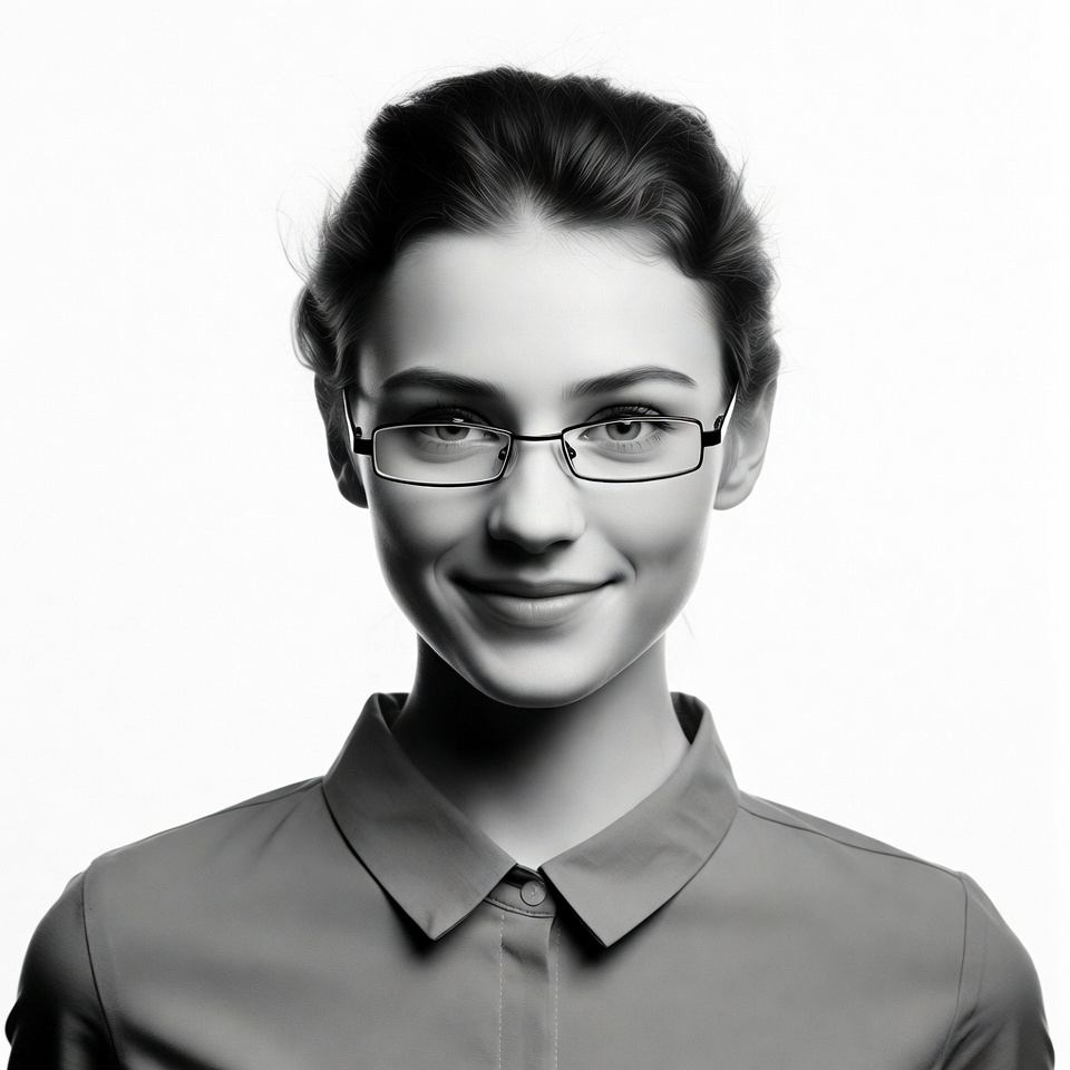 A young woman with dark hair styled in an updo smiles at the camera. She wears thin rectangular glasses and a collared shirt. The portrait is in black and white against a plain white background.