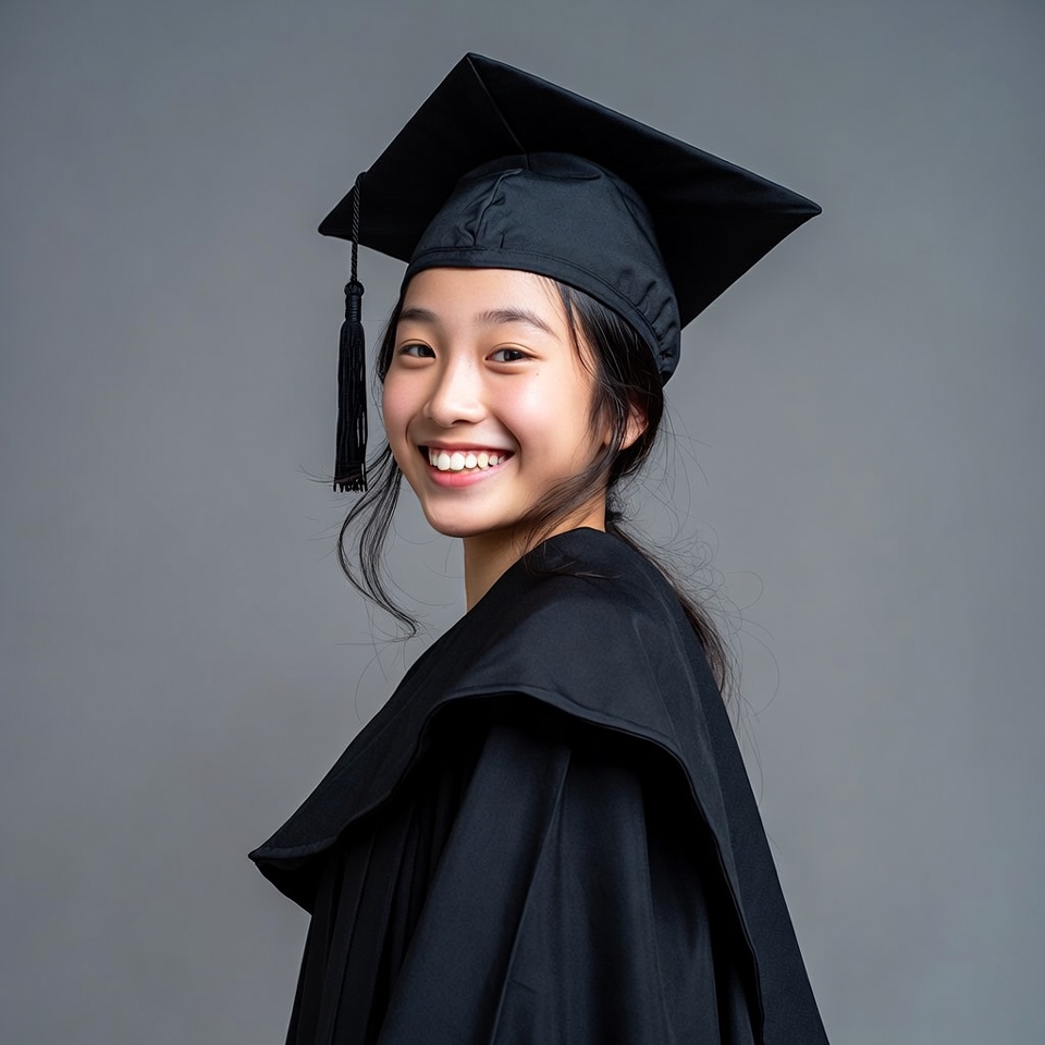 A young Asian girl with long dark hair smiles over her shoulder while wearing a black graduation cap and gown. She stands against a plain gray background with the tassel hanging from her cap. Her gown features draped folds over the shoulders.