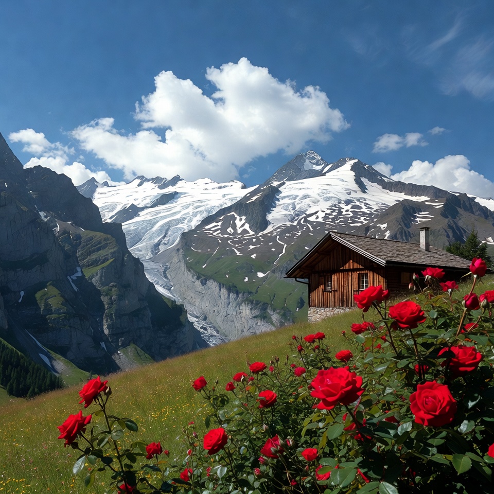 A wooden chalet with red roof sits in a green alpine meadow surrounded by vibrant red rose bushes. Snow-capped mountains and a glacier rise dramatically in the background under a clear blue sky with white clouds. Lush green valleys and rocky peaks frame the scenic landscape.