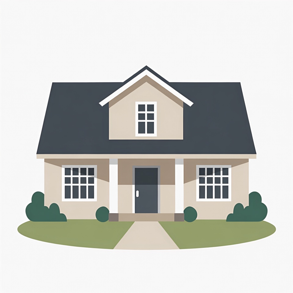 A simple flat illustration of a beige suburban house with a dark gray gabled roof and white-trimmed windows. The house features a covered front porch with a dark door flanked by two windows and small green bushes on either side. A concrete walkway leads from the porch to the green lawn on an isolated white background.