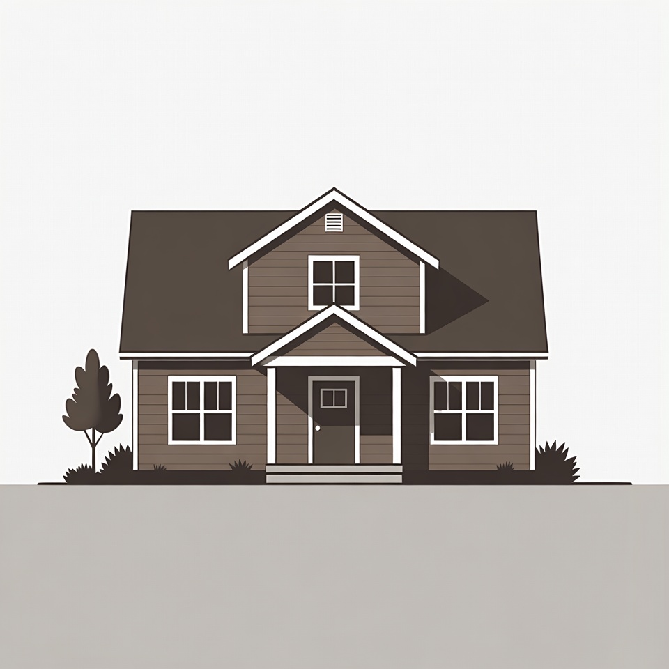 A simple flat illustration of a two-story brown house with a gabled roof and front porch. The house features multiple windows, a central door, and white trim accents. A tree stands to the left with bushes on both sides, all on a white isolated background.