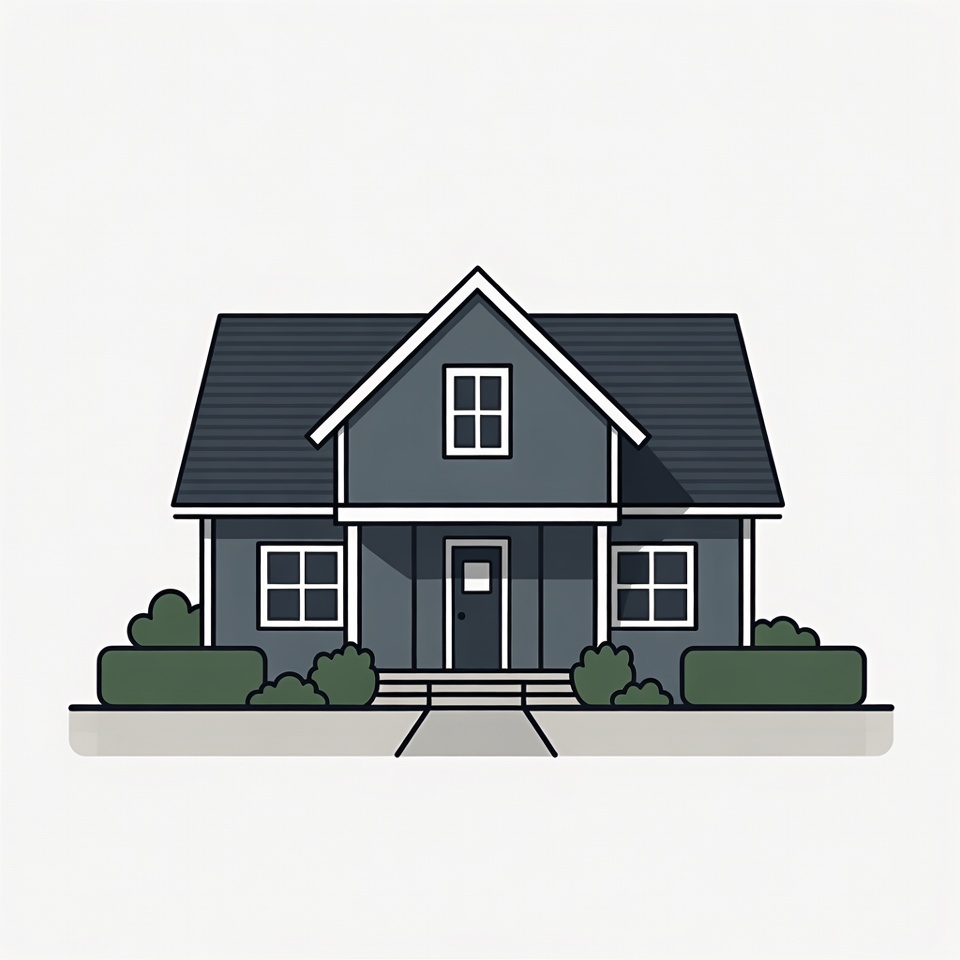 A line art illustration of a modern two-story house features a dark gray exterior, pitched roof, and covered front porch with steps. Symmetrical windows flank a central dark door, surrounded by neatly trimmed green shrubs on both sides. The house sits on a light gray path against an isolated white background.