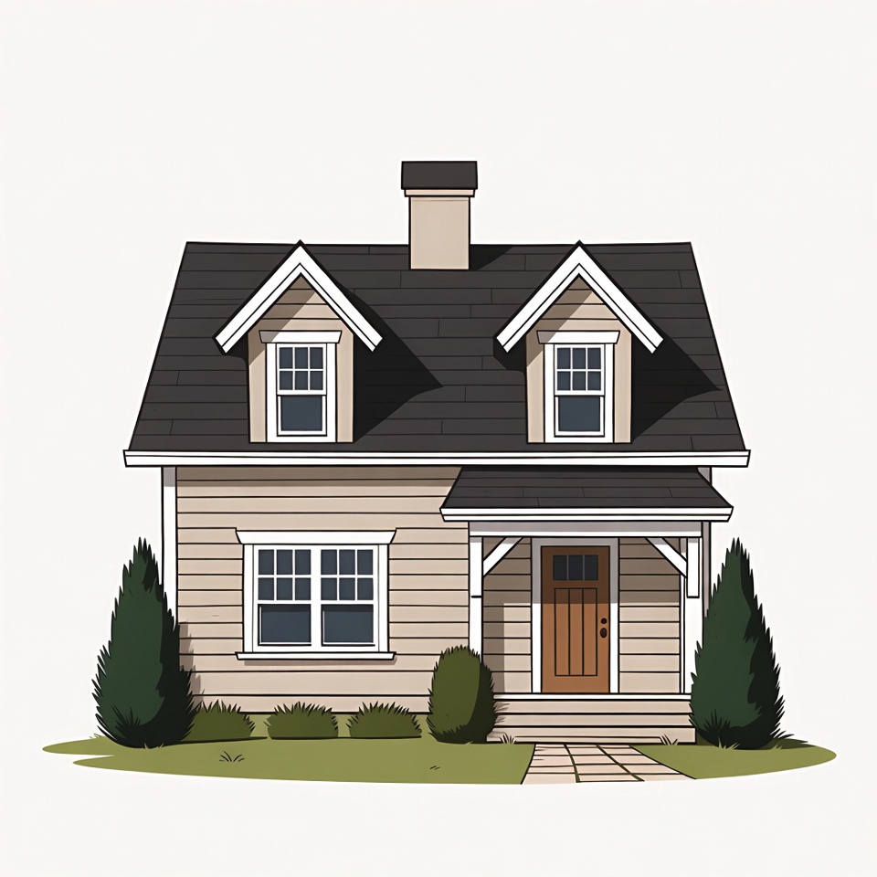 architecture, beige siding, bushes, cartoon house, chimney, clipart, cozy house, dark roof, dormer windows, front porch, gable roof, grass, home, illustration, isolated background, lawn, pathway, residential, shrubs, simple house, suburban home, vector art, wooden door, house
