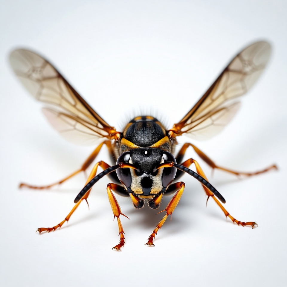 antennae, arthropod, black yellow, bug, close-up, compound eyes, flying insect, hornet, insect, legs, macro photography, nature, sharp focus, stinger, striped body, vespidae, wasp, white background, wings spread, yellow jacket