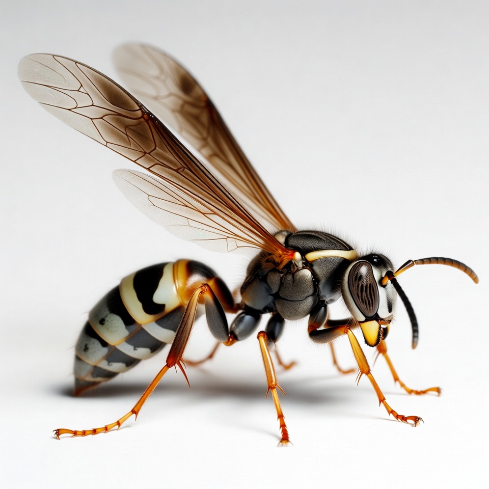 arthropod, black yellow stripes, bug, close-up, compound eyes, detailed, flying insect, insect, isolated background, macro photography, nature, orange legs, paper wasp, stinger, white background, wildlife, wings, yellow jacket, wasp