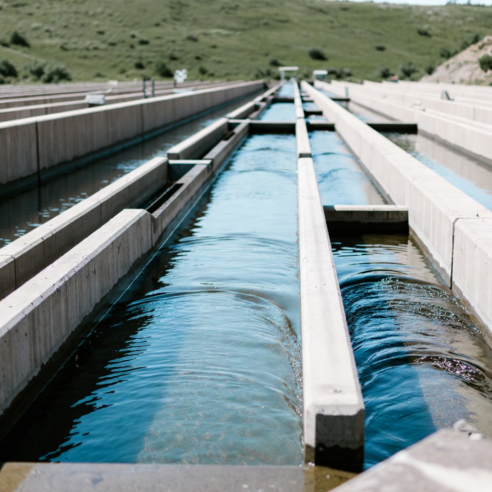 Multiple parallel concrete channels filled with flowing blue-green water are arranged in rows on a grassy hillside. The channels feature straight edges and dividers, with water currents visible in the central troughs. Surrounding terrain includes green slopes and distant hills under a clear sky.