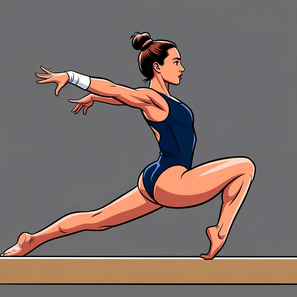 An illustration of a woman performing a gymnastic pose on a balance beam. She has brown hair in a bun, wears a blue leotard and wristbands, and extends her arms and one leg dynamically. Her muscular legs are split with bare feet on the wooden beam against a gray background.