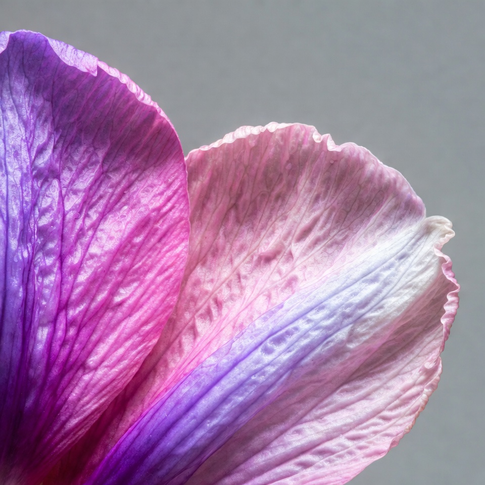 exotic bloom, floral macro, flower closeup, flower detail, flower petal, fringed edges, gradient petals, gray background, hibiscus petal, nature macro, petal texture, petal veins, pink flower, pink petals, purple flower, purple petals, tropical flower, vibrant flower, white edges, hibiscus flower