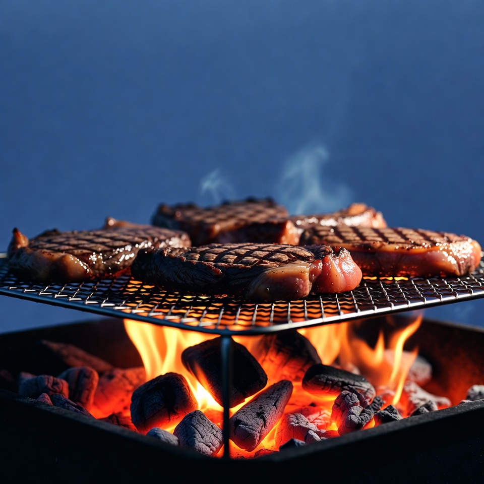 Several juicy grilled steaks with visible grill marks sit on a metal grill grate over glowing charcoal flames. Smoke rises from the sizzling meat, set against a dark blue background. The steaks glisten with juices and fat, arranged closely together on the fiery barbecue.