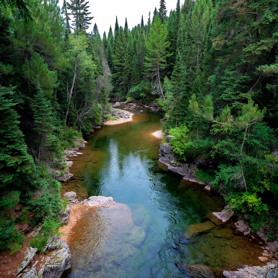 A serene river winds through a dense forest of tall evergreen trees. The water displays shades of green and turquoise with sandy banks and rocky edges. Lush green foliage lines both sides of the river under a partly cloudy sky.