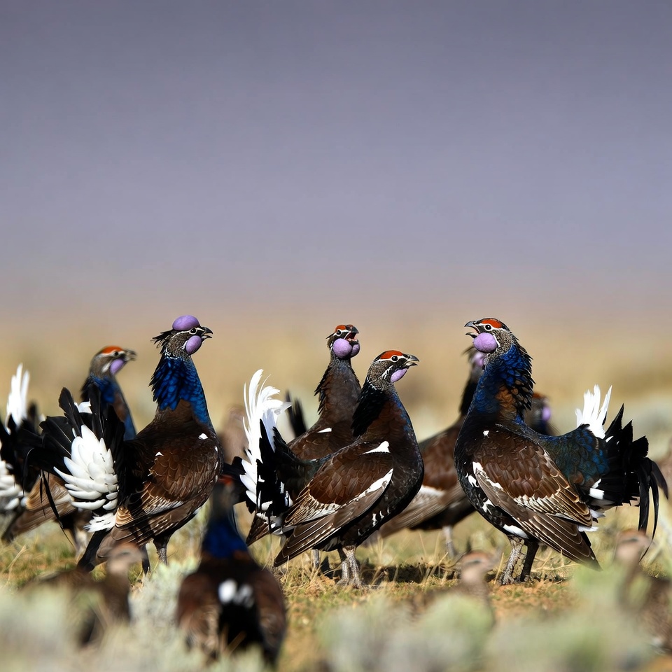 animal group, avian, birds, blue neck, displaying, feathers, flock, grassy field, group, grouse, male birds, nature, outdoors, purple crest, purple sky, western capercailzie, white tail feathers, wildlife, woodland grouse, capercailzie