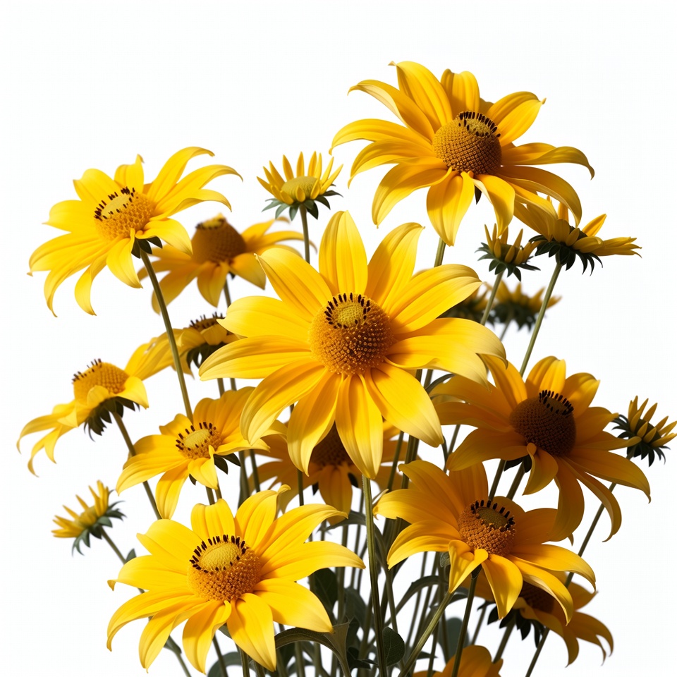 blooming flowers, dark centers, floral arrangement, flower bouquet, flower petals, fresh flowers, garden flowers, green stems, isolated background, nature, plants, vibrant yellow, white background, yellow flowers, sunflowers