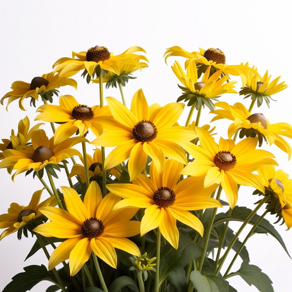 blooms, bouquet, brown centers, daisy flowers, floral arrangement, flower cluster, fresh flowers, green stems, isolated background, petals, rudbeckia, sunflowers, vibrant yellow, white background, yellow flowers, black-eyed Susan