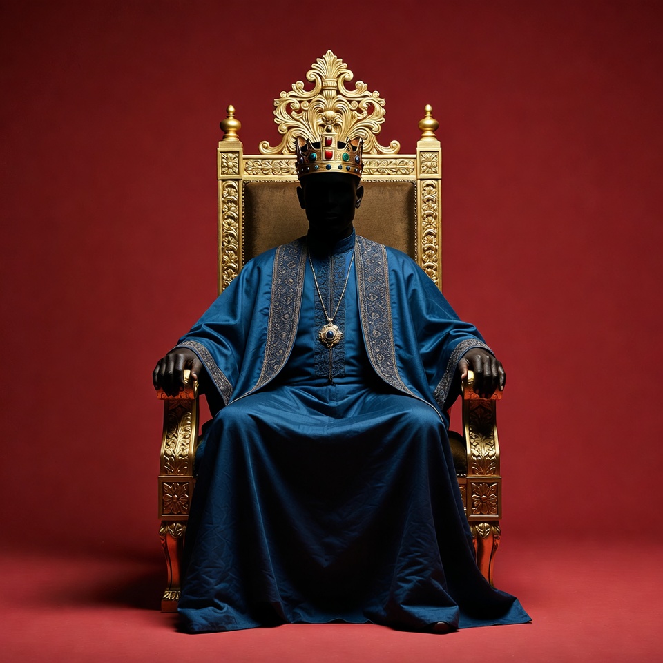 African, African king, Black man, armrests, blue robe, crown, embroidered robe, gold jewelry, golden throne, majesty, male, ornate chair, red background, regal, royal, shadowed face, sitting, throne, king