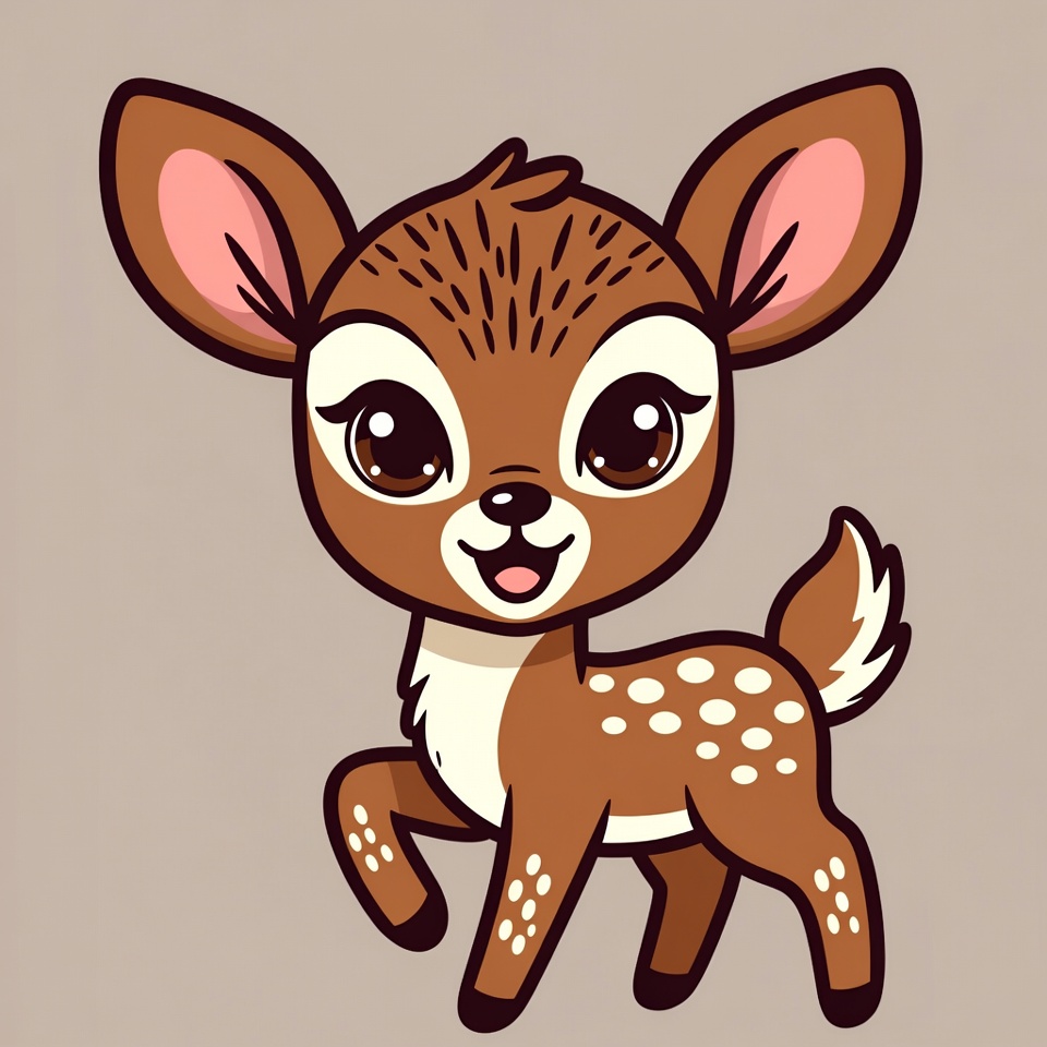 A kawaii-style cartoon baby deer with large sparkling eyes and brown fur stands playfully on a light gray background. It features white spots on its body, pink inner ears, and a small white tail. The deer smiles happily with one front leg lifted.