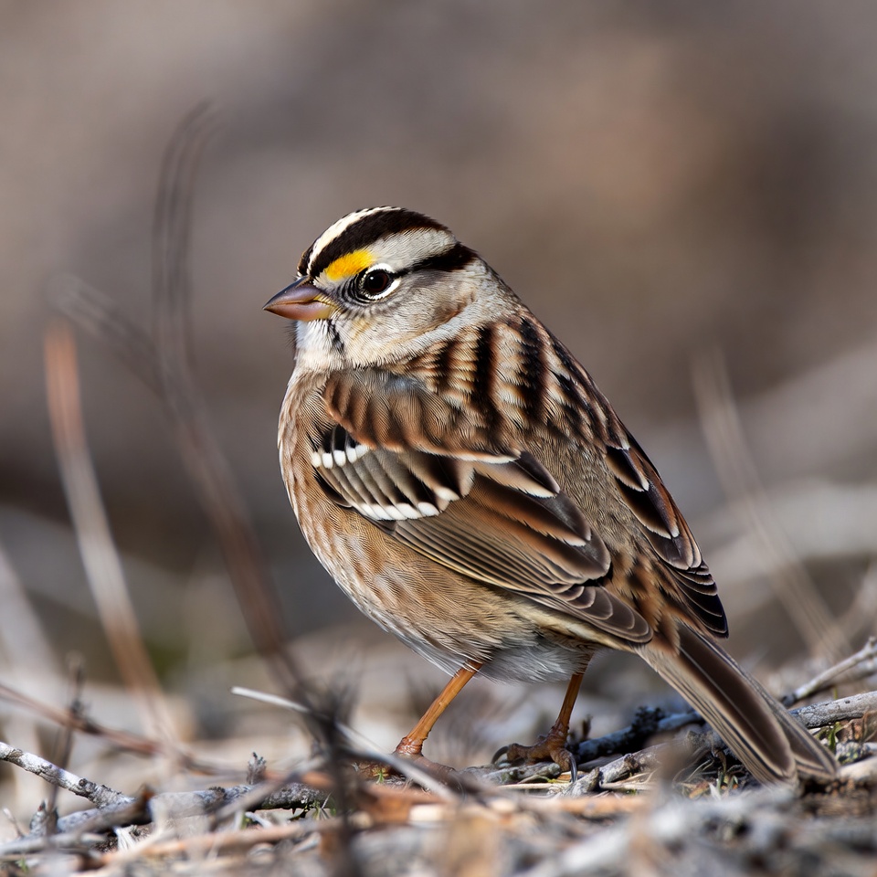 avian, bird, black stripe, blurred background, brown bird, dry ground, feathers, nature, orange bill, passerine, songbird, sparrow, striped feathers, tail, wildlife, wings, yellow stripe, white-crowned sparrow