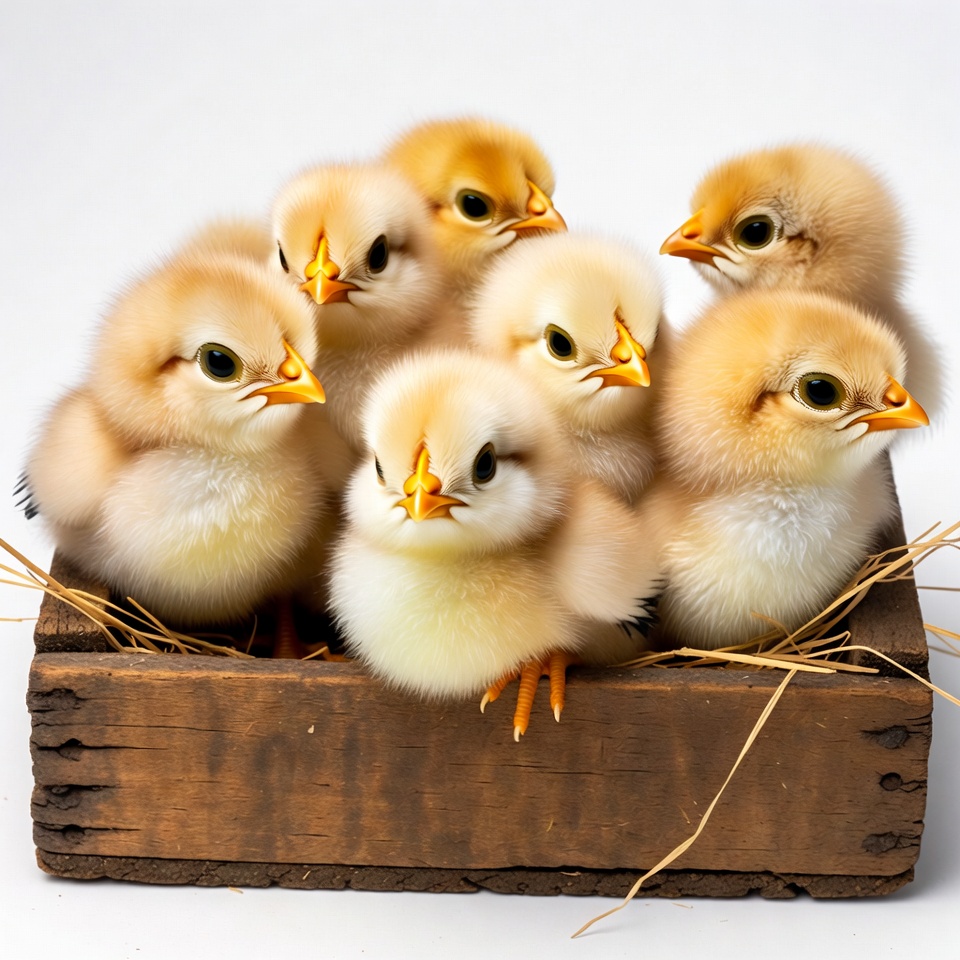 A group of fluffy yellow baby chicks huddles together in a rustic wooden box filled with straw. Their bright orange beaks and feet stand out against the soft downy feathers. The chicks gaze curiously at the camera from their cozy nest.