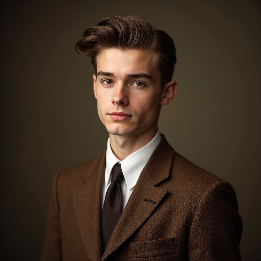 A young man with neatly combed brown hair poses confidently against a dark background. He wears a brown tweed suit jacket, white dress shirt, and dark tie. His expression is neutral with direct eye contact.