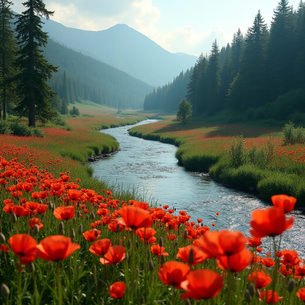 A vibrant red poppy field lines both sides of a winding clear river flowing through a lush green valley. Tall pine trees dot the landscape, with majestic snow-capped mountains rising in the background under a partly cloudy sky. The scene captures a serene natural pathway surrounded by dense forests.