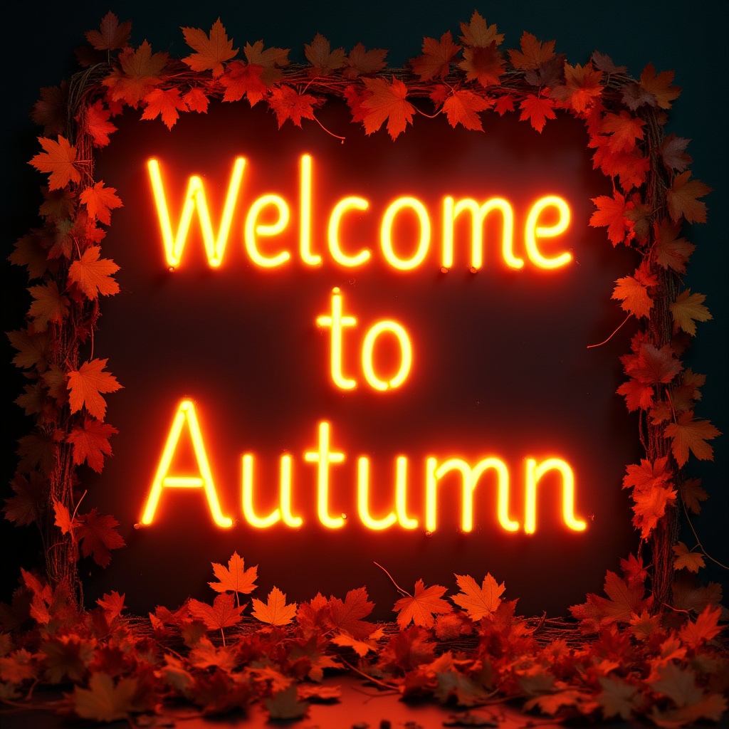 A glowing neon sign reads 'Welcome to Autumn' in bright yellow letters. It is framed by a wreath of vibrant red autumn leaves on a dark background. The design features a festive fall theme with intricate leaf details.