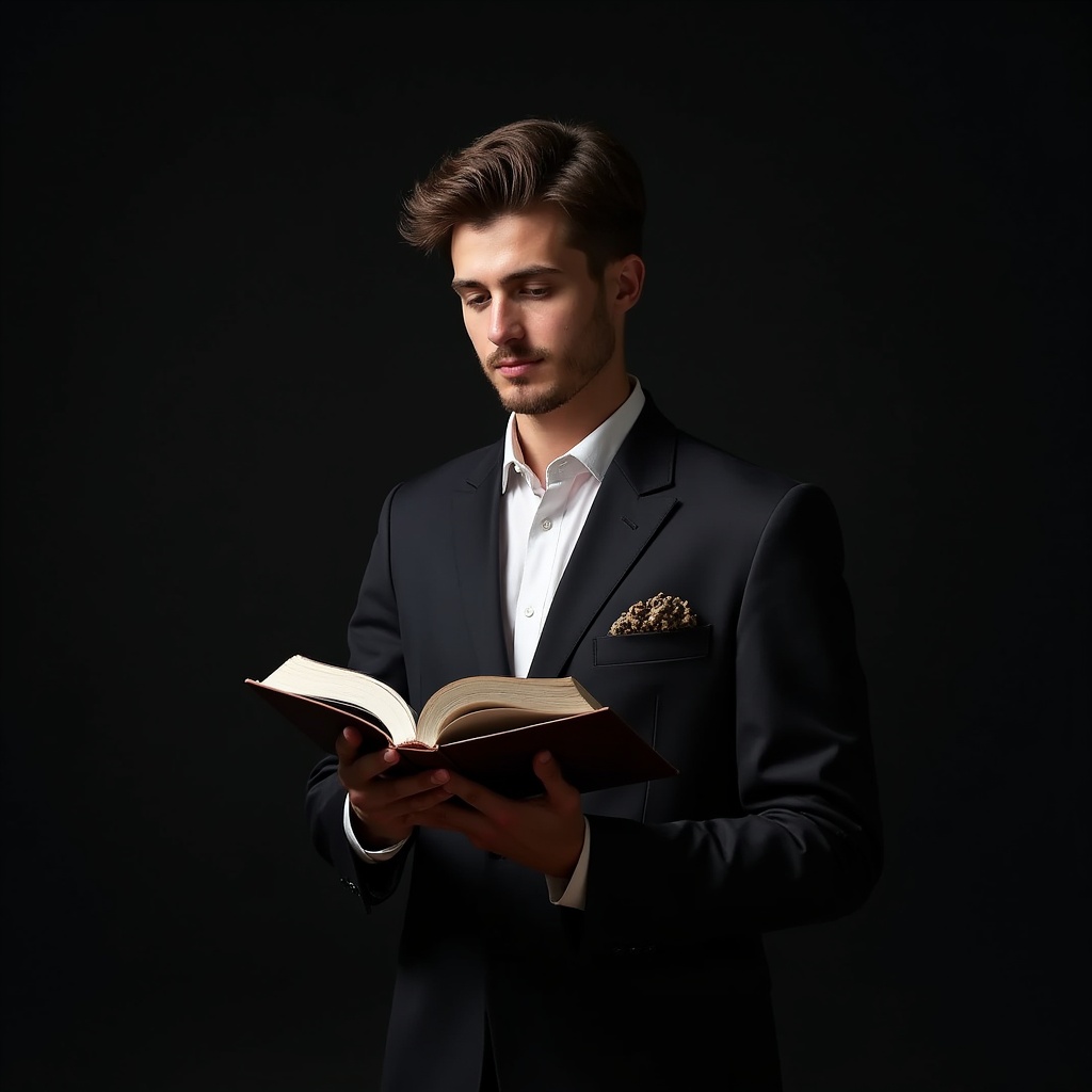 A young man with short brown hair and a mustache wears a black suit with a white shirt and pocket square. He holds an open brown book with both hands, reading attentively. The image features a dark background with soft lighting highlighting his face and the book.