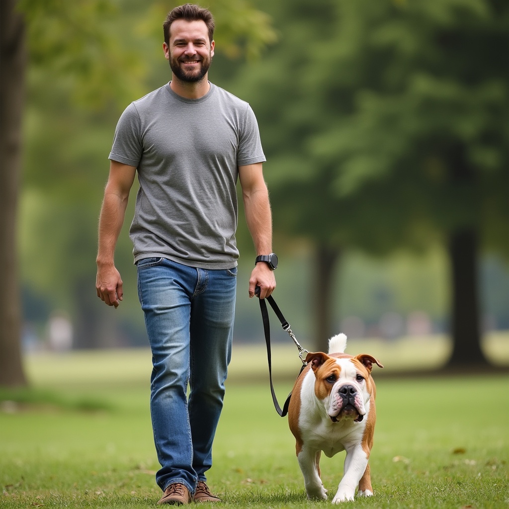 A man with a beard and short hair wears a gray t-shirt and blue jeans while walking a white and brown bulldog on a leash. They stroll on green grass surrounded by trees with autumn foliage. The dog walks ahead energetically with its tail up.