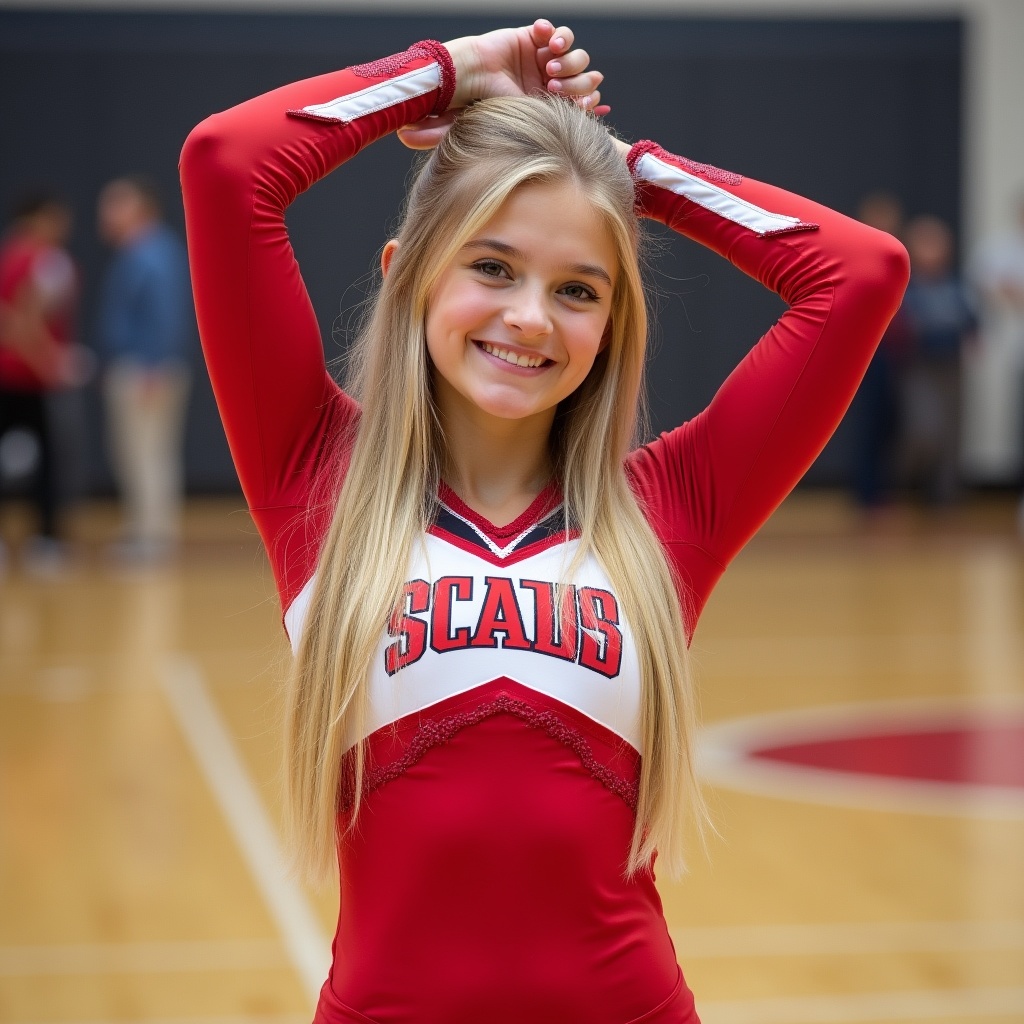 A young blonde girl with long hair smiles while posing with arms raised, wearing a red and white cheerleading uniform with 'SCS' lettering. She stands on a gymnasium floor with wooden court lines and a blurred background of other people. Her uniform features white sleeves with red stripes and a pleated skirt.
