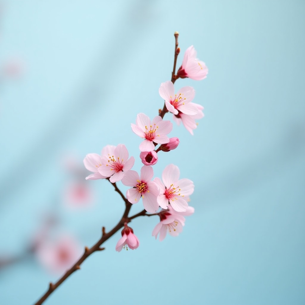 bloom, blossoms, branch, buds, floral, flower cluster, isolated, light blue background, nature, petals, pink flowers, slender branch, soft pink, spring flowers, yellow centers, cherry blossom