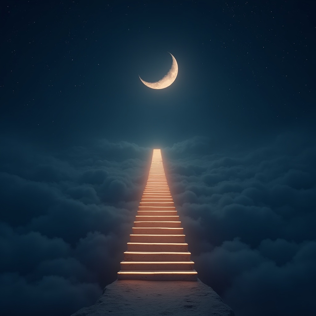 A glowing golden staircase ascends through dark blue clouds toward a bright crescent moon in the night sky. The stairs emit a soft neon light and lead to a distant horizon. The scene features a starry night with ethereal, fluffy clouds surrounding the path.