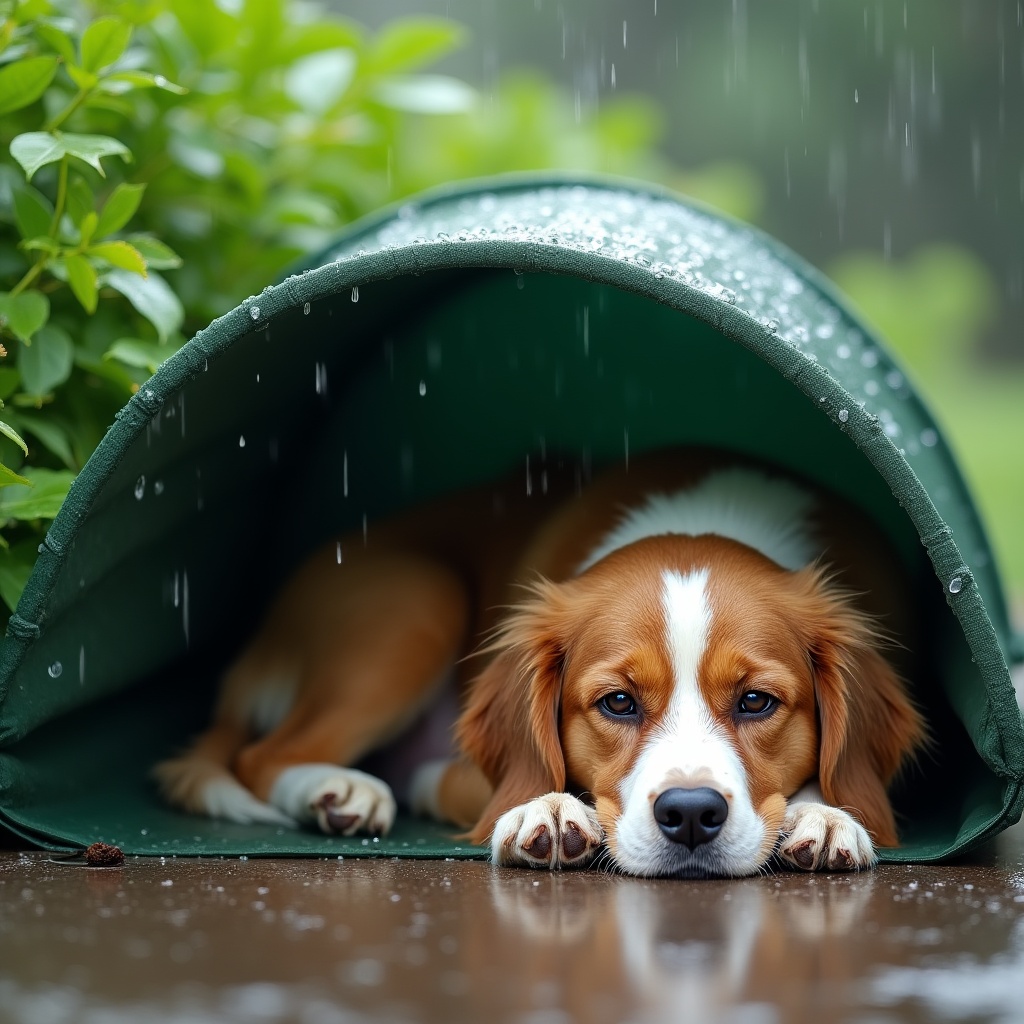 A brown and white dog with floppy ears lies inside a green plastic tunnel shelter during heavy rain. Surrounding green bushes and wet ground are visible, with raindrops falling around the enclosed dog. The dog's paws extend from the tunnel opening onto the puddle-covered surface.