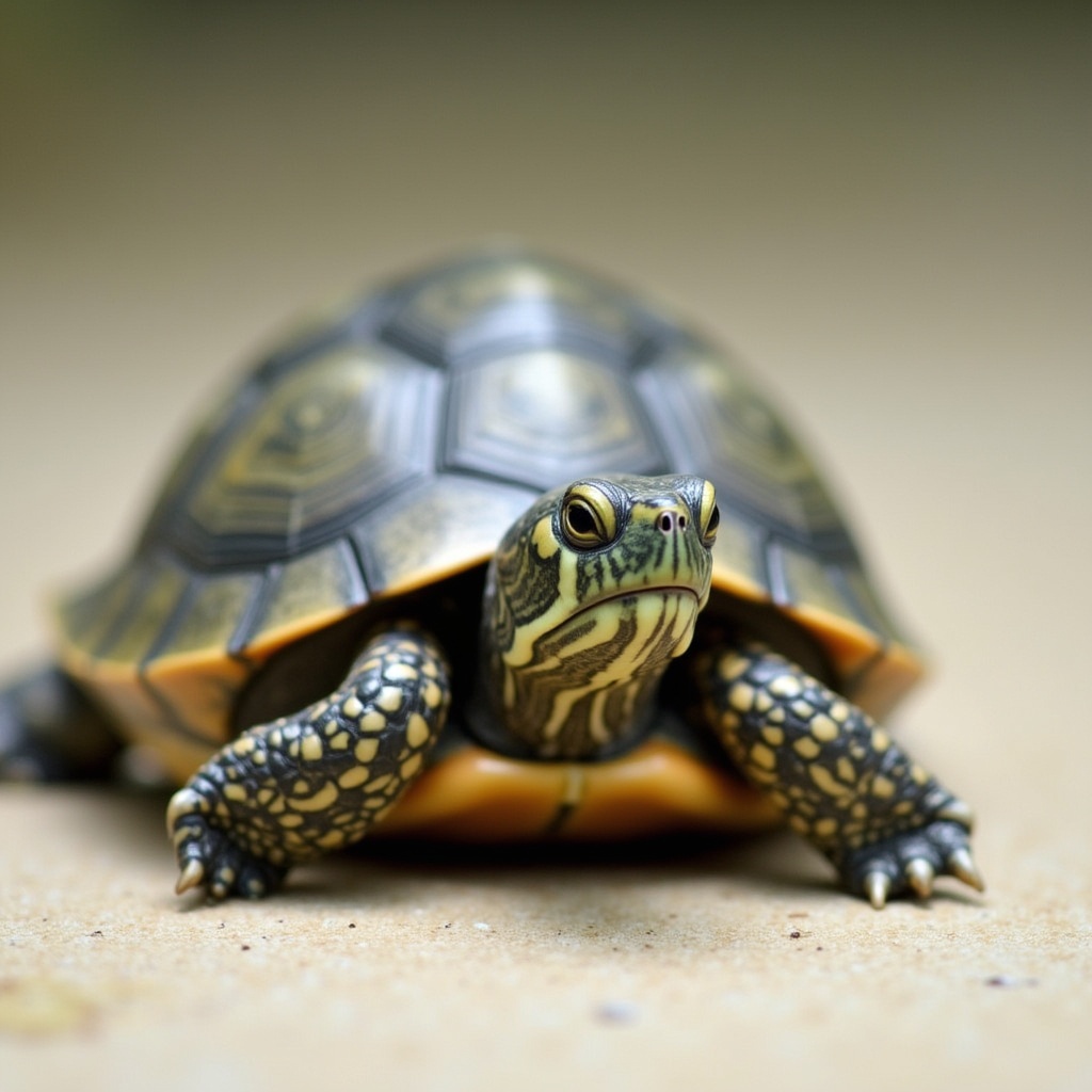 A small ornate slider turtle faces forward with its head extended. It features a dark green shell with intricate yellow hexagonal patterns and striped markings on its head and legs. The turtle stands on a plain light brown background.